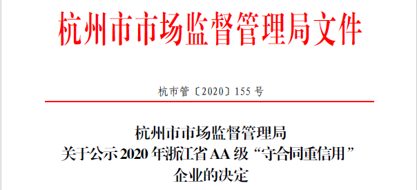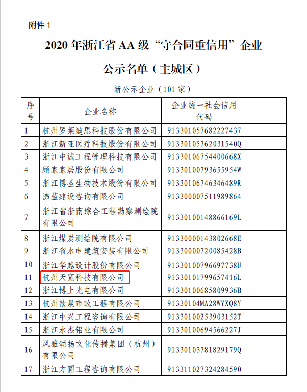近日,2020年浙江省AA級“守合同重信用”企業名單公示,天寬榜上有名。這也是公司首次申報浙江省“守合同重信用”企業,并獲準直接參加AA級評定。
