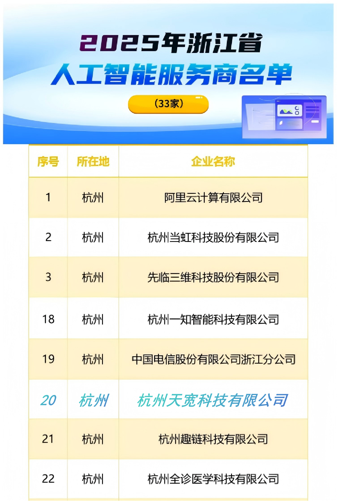 本次遴選工作緊密圍繞國務院“人工智能+”行動的戰略部署,旨在全面推進人工智能賦能新型工業化,加速創新應用,為產業深度轉型與高質量發展注入核心驅動力。值得注意的是,“浙江省人工智能服務商”作為省級權威榮譽,評選標準極為嚴格,本次最終入選企業僅33家,其中不乏阿里云等頭部民營企業以及傳播大腦、浙江電信、華數等大型國有企業,本次天寬科技入選,是長期深耕AI產業、致力于破解行業應用難題的實力印證。